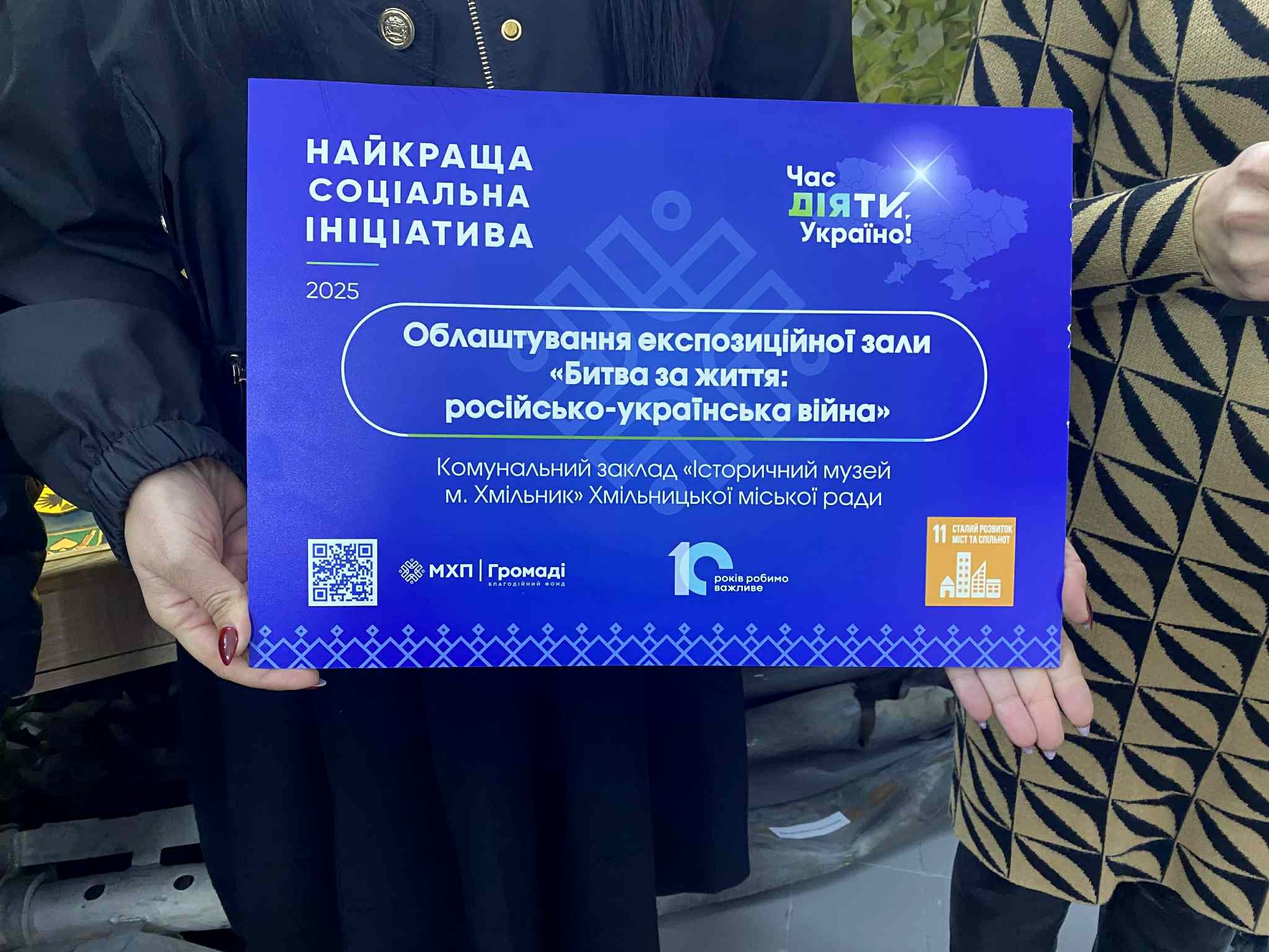 Проєкт Комунального закладу «Історичний музей м. Хмільник» Хмільницької міської ради «Облаштування експозиційної зали «Битва за життя: російсько-українська війна» став переможцем конкурсу «Час діяти, Україно!»-2025, що організований Благодійним фондом «МХП – Громаді» за підтримки Хмільницької міської ради.