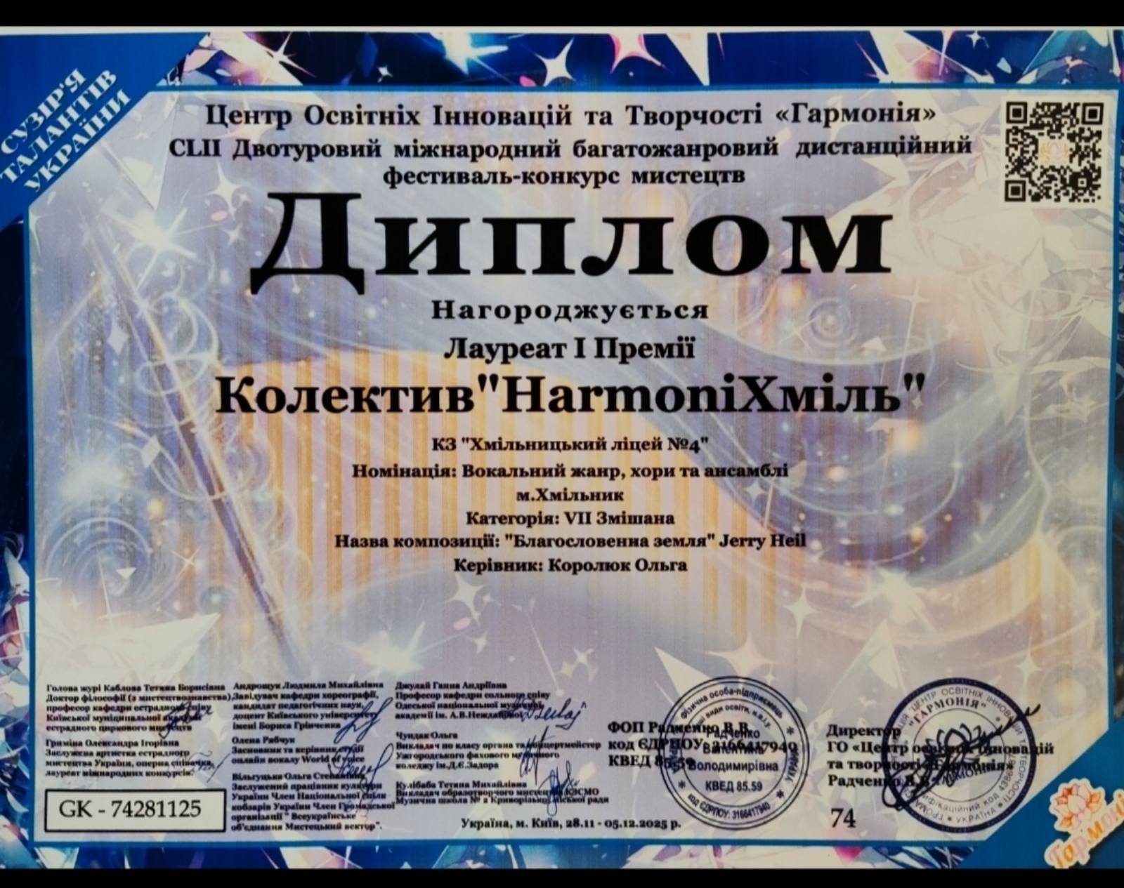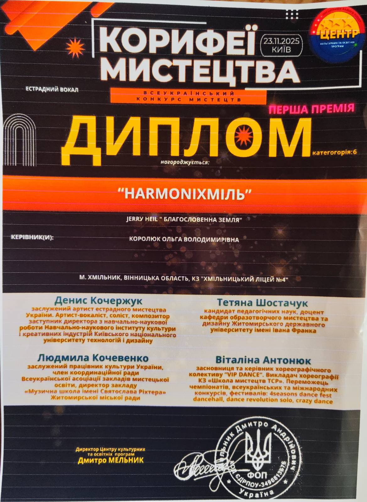 Ансамбль «HarmoniХміль» здобув І місце у Всеукраїнському конкурсі мистецтв «Корифеї мистецтва» (м. Київ) а також І місце у Міжнародному двотуровому конкурсі мистецтв «Сузір’я талантів України» (м. Київ).