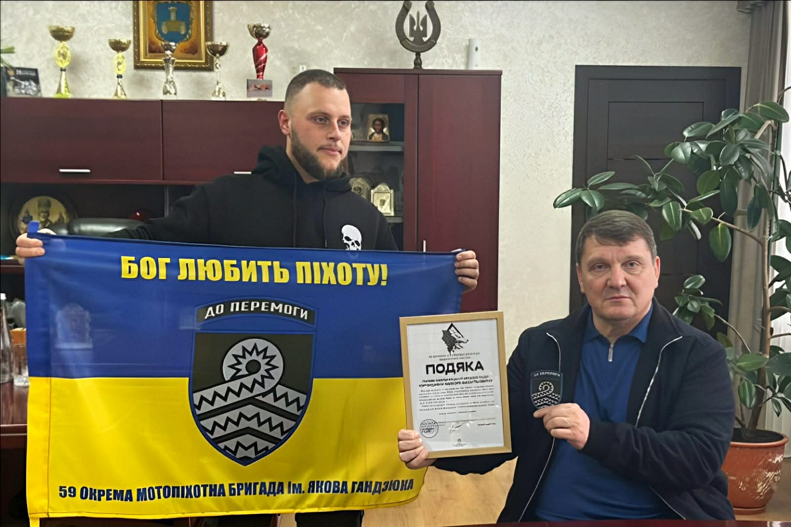 Юнак прийшов із бойовим стягом, щоб подякувати колективу Хмільницької міської ради та закладам культури за підтримку оперативних запитів бригади.