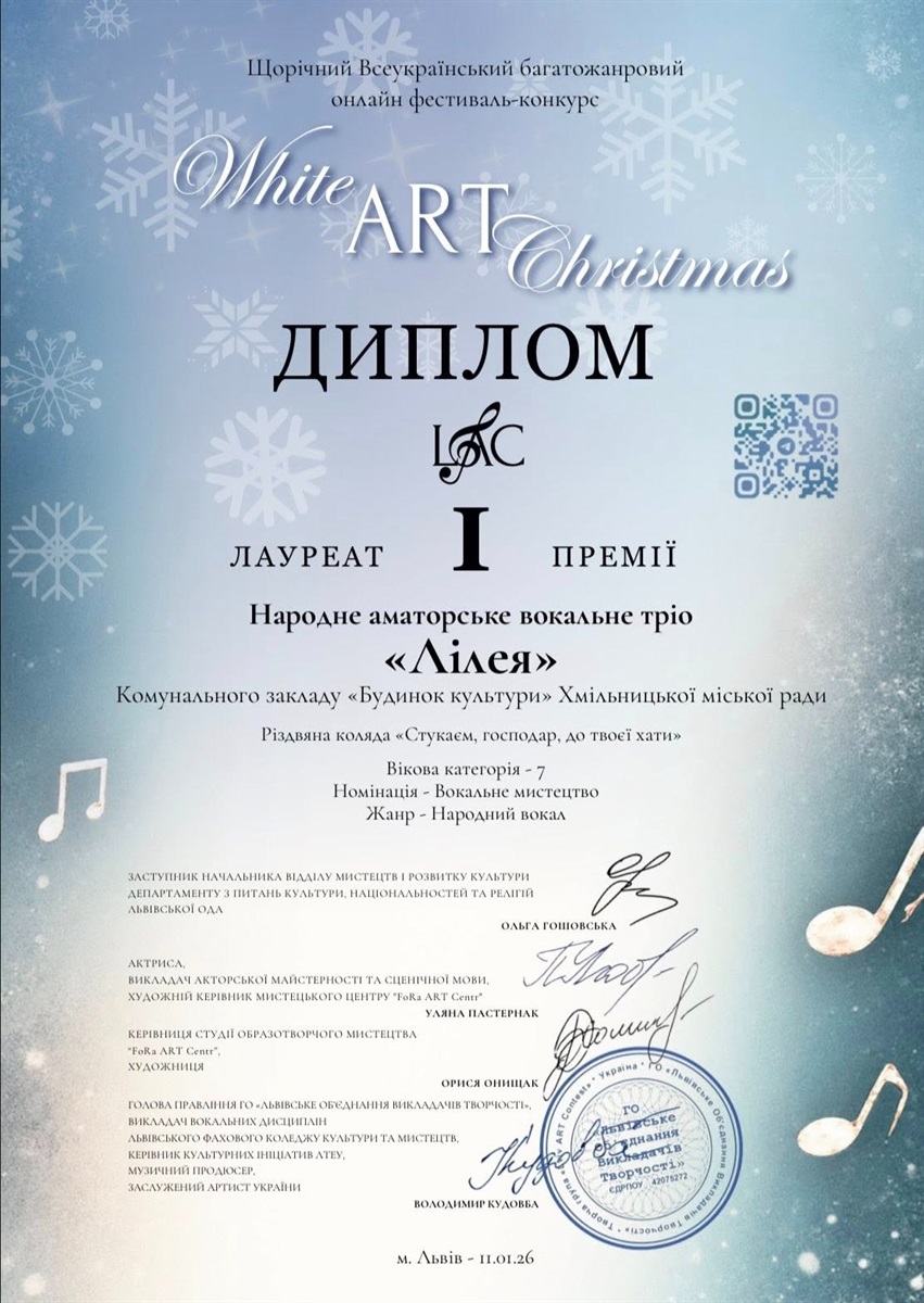 Народне аматорське вокальне тріо «Лілея» при Будинку культури - лауреат І премії щорічного Всеукраїнського багатожанрового онлайн-фестивалю-конкурсу «White Art Christmas», - повідомляють у Комунальному закладі "Будинок культури" Хмільницької міської ради.
