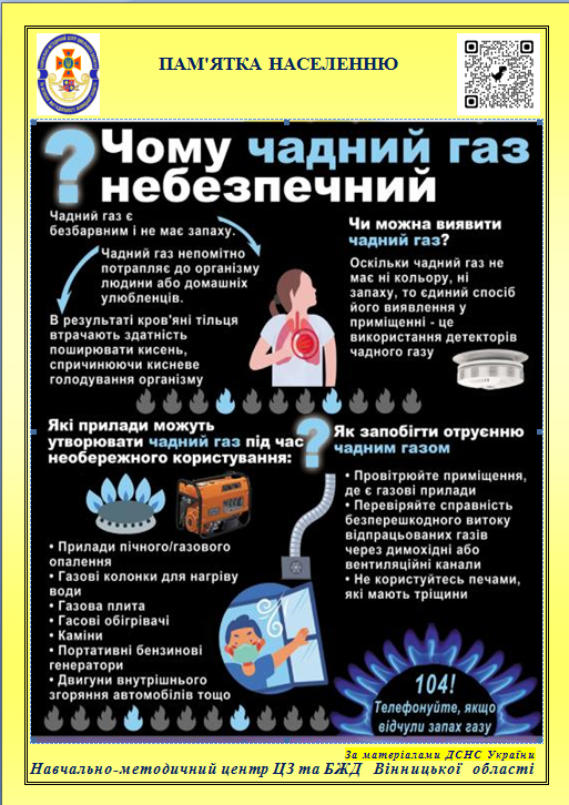 Навчально-методичний центр цивільного захисту та безпеки життєдіяльності Вінницької області інформує населення про небезпеку чадного газу.
