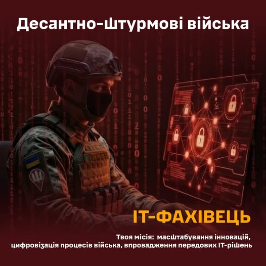 Десантно-штурмові війська ЗС України розбудовують потужну цифрову вертикаль, і нам потрібні саме ви. Ми шукаємо вмотивованих фахівців (офіцерів та сержантів), які готові конвертувати свій IT-досвід у реальну боєздатність війська.