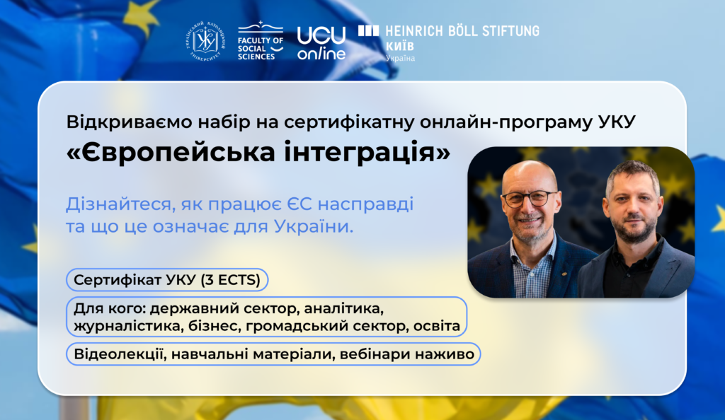 Сертифікатна онлайн-програма допоможе розібратися в логіці європейської інтеграції — від історії, цінностей і правил ЄС до інституцій, процесів ухвалення рішень і ключових політик. Окремий і постійний фокус — український контекст: реформи, переговори про членство, можливості й обмеження на цьому шляху.