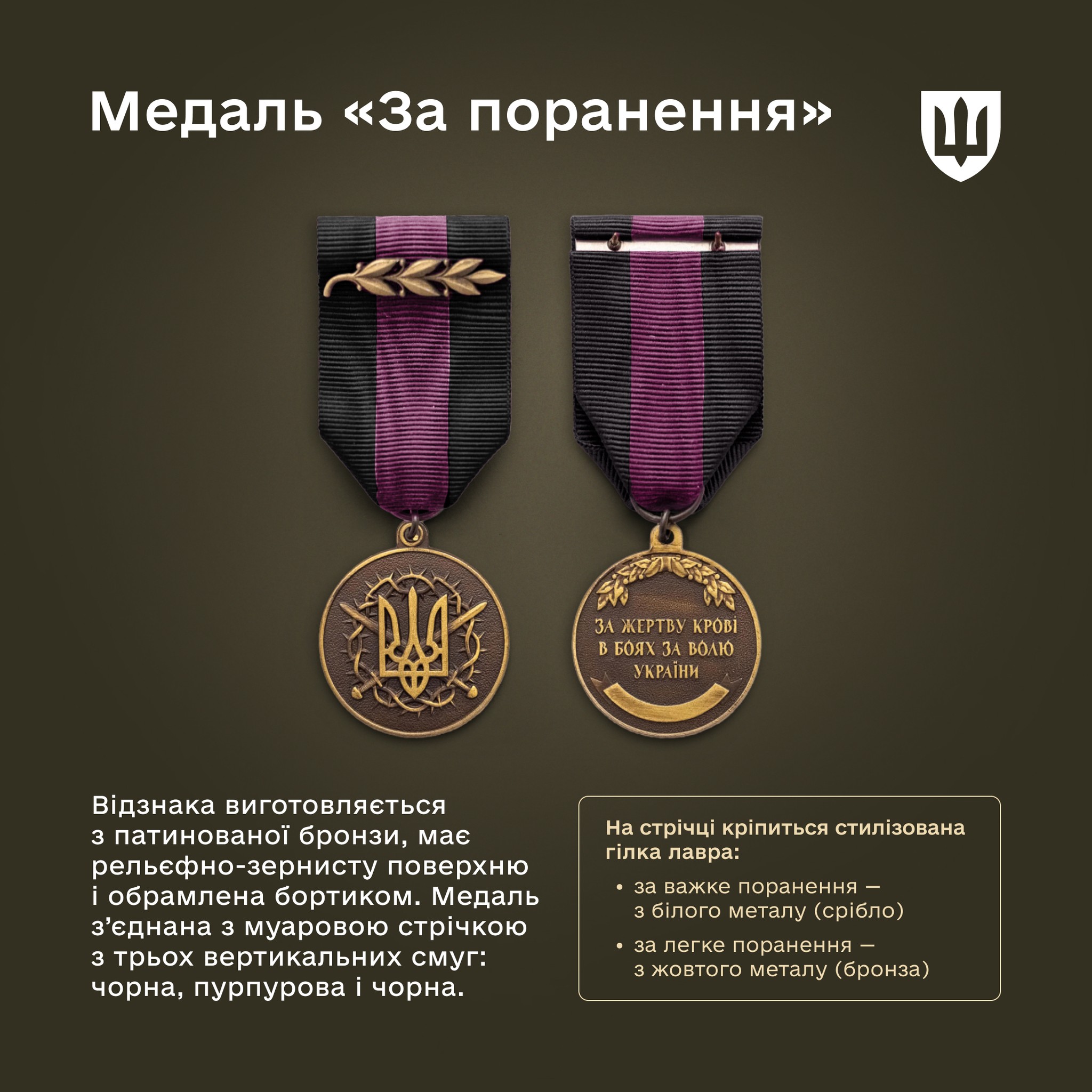 Ця відзнака призначена для військовослужбовців Збройних Сил України, які отримали легке або важке поранення. Головною ж умовою є поранення саме в ході бойових дій під час захисту держави.